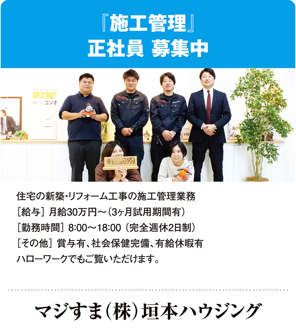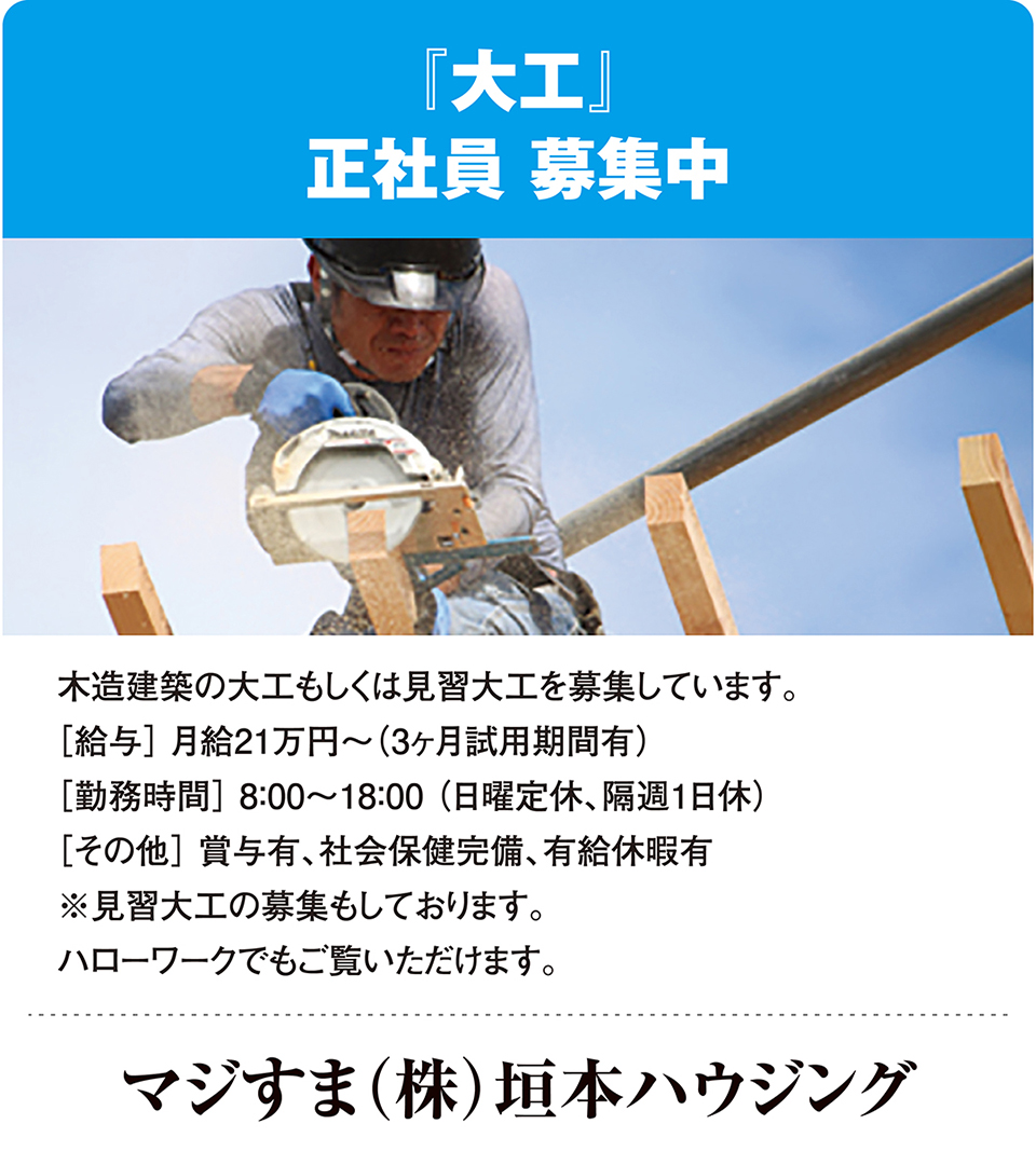 香芝市で50年以上の実績がある、地域密着型の工務店です。『マジすま』の名前の通り、本気で住まいの事を考え、お客様の暮らしに合わせたお家と“マジすま”だからこそ出来る、きめ細かなリフォームと安心のサービスをご提案いたします。