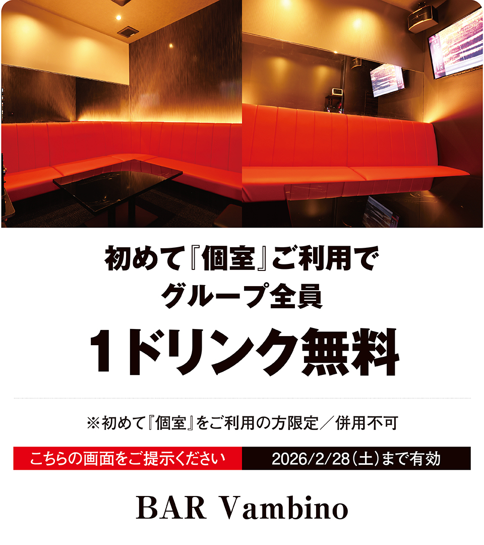 大和八木駅・徒歩2分の『バンビーノ』です。カウンター席、テーブル席、カラオケ付きの完全個室ルーム2部屋、大人気ゲーム『ビアポン』も完備!!アルコールはもちろん、フード類も多数ご用意。八木での“夜遊び”はぜひ当店で!!“歓送迎会”での貸切予約受付中!!