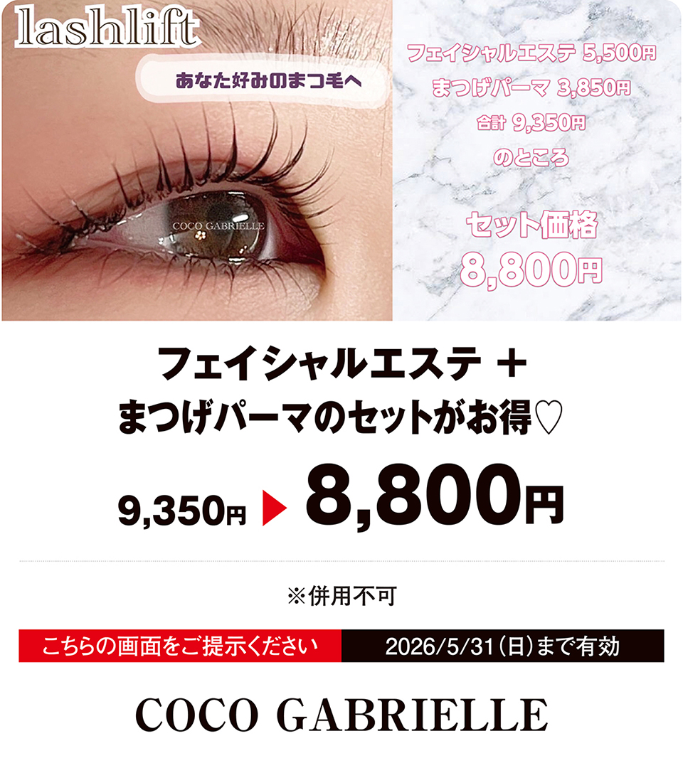 23年の経験から生み出されたCOCO GABRIELLEの施術は一言で「感動!!」していただけることを目指しております。沢山の情報をご提供できることでなりたい私を叶えていきます♡エステ、脱毛、まつ毛パーマ、まつ毛エクステの他、プラズマニアも大好評です♡